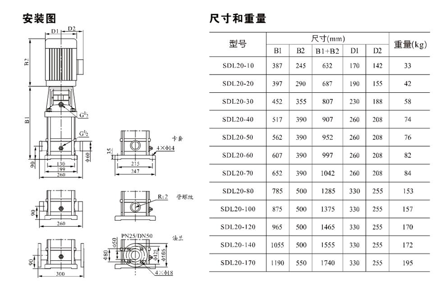 SDL20/SDLT20為配用標準電機的非自吸立式多級離心泵,電機軸和泵軸用聯軸器直接聯接,把拉桿用螺母將外筒,過流部件固定在支架和進出水體之間,泵進出水口在泵底部的同一直線上。泵可根據需要配置智能保護器,對泵的干轉、缺相、過載等進行有效的保護。